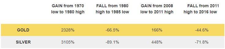 Here are some examples of how gold and Silver performed during some of the biggest bull and bear markets in modern history: