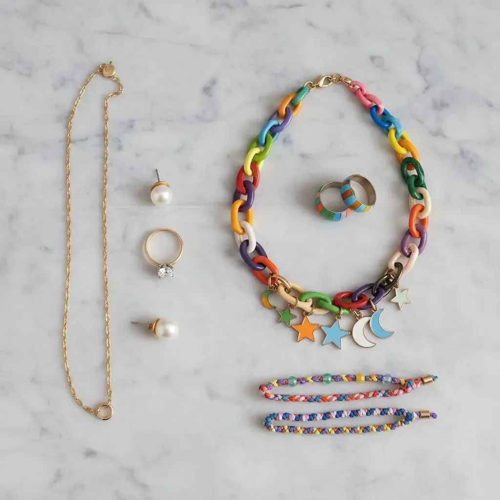 While investment pieces are timeless, trendy jewelry offers experimentation and fun. Play with bold colors, unusual shapes, and new materials without major financial commitments. Trends are fleeting, so save your money. Consider chunky acrylic rings, colorful enamel hoops, body chains, or Y2K plastic necklaces.